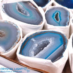 You will recieve 1 Box of Blue Agate Cut Base Geodes as photographed. Measurements are of box with Agate Cut Base Geodes inside.